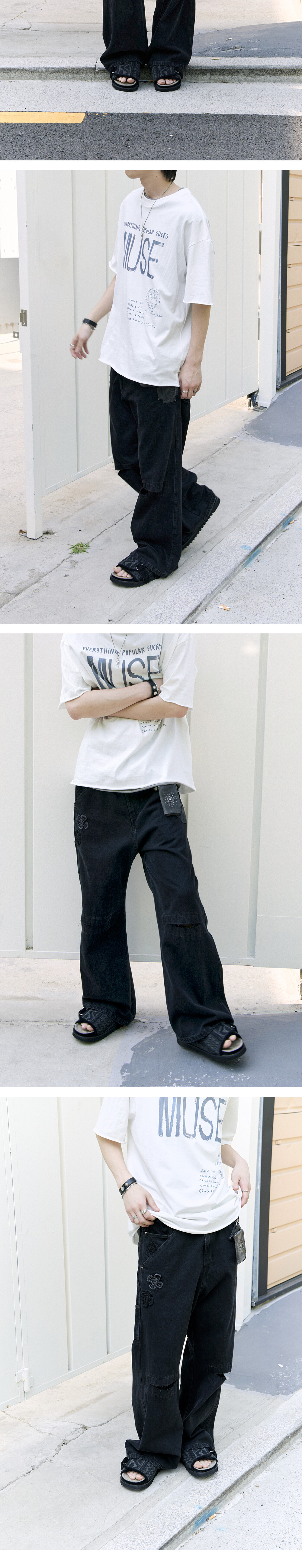 (09.17 PM6:00) 1011 cross patched denim pants (cut off knee) - black