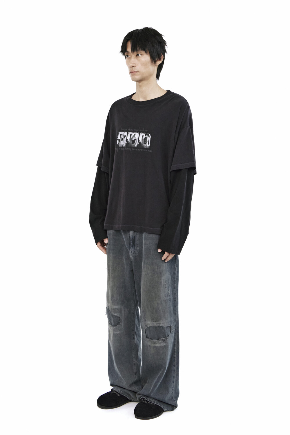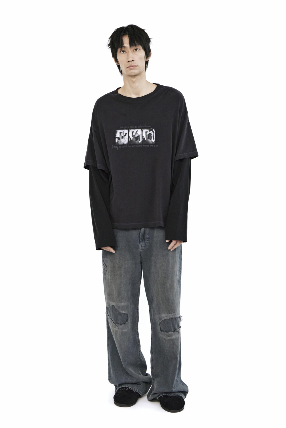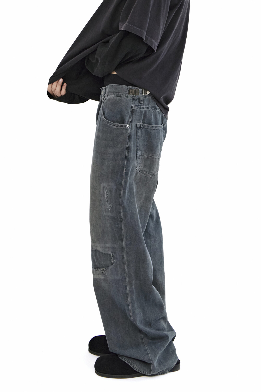 무릎 부분에는 과감한 컷아웃과 패치워크,
