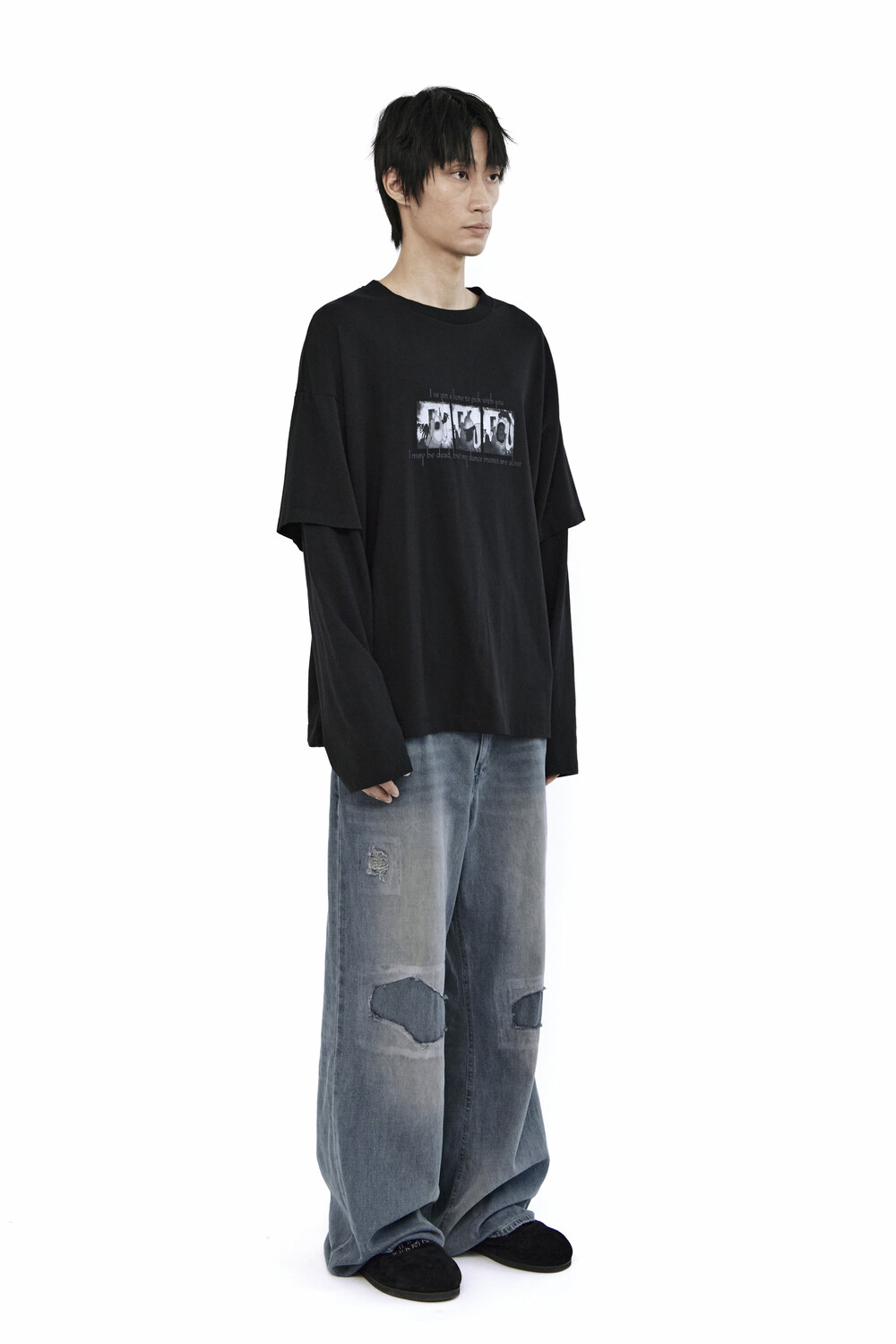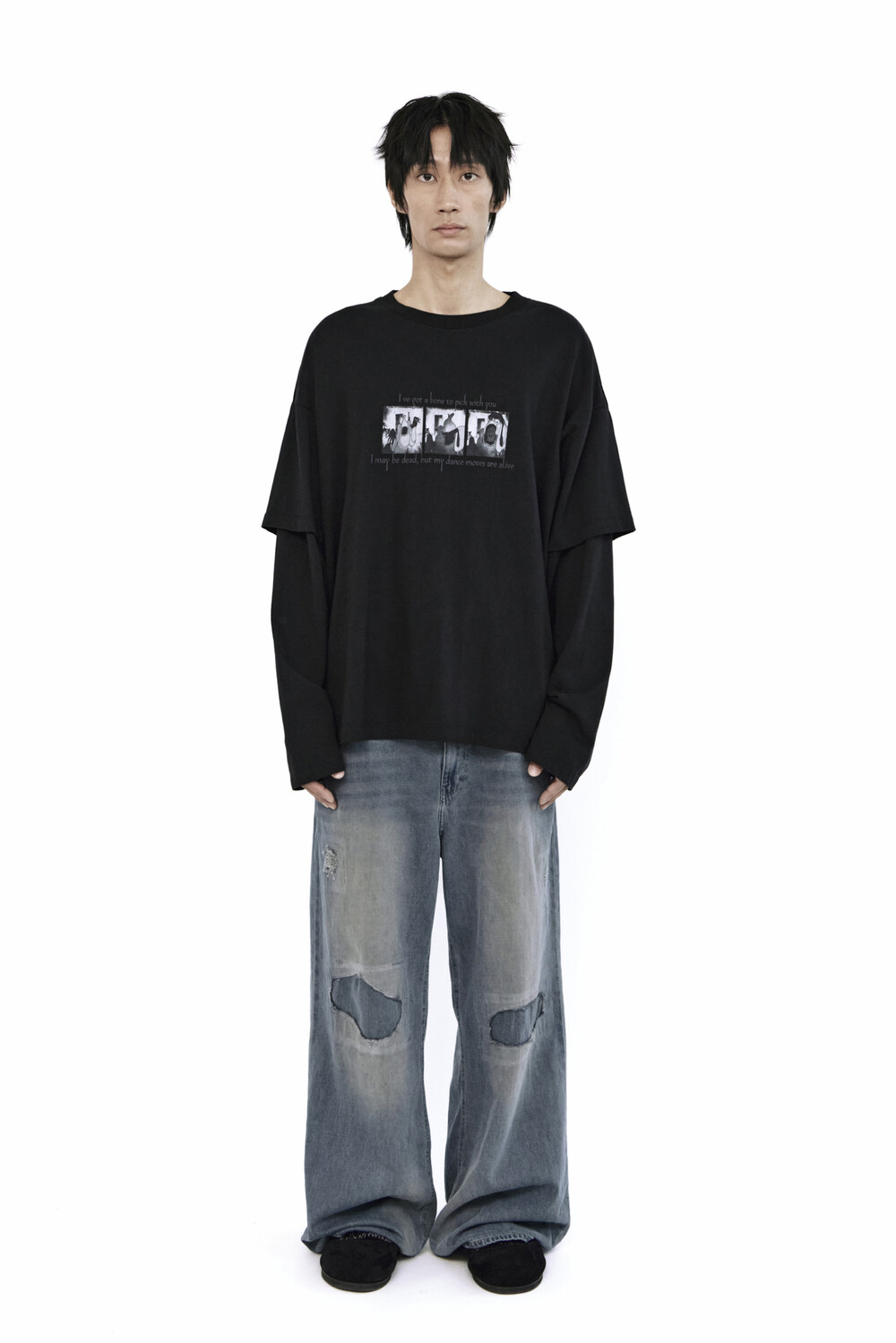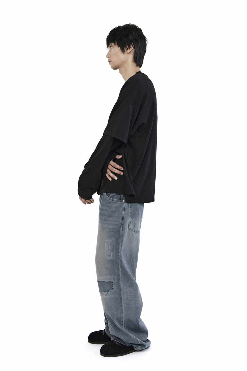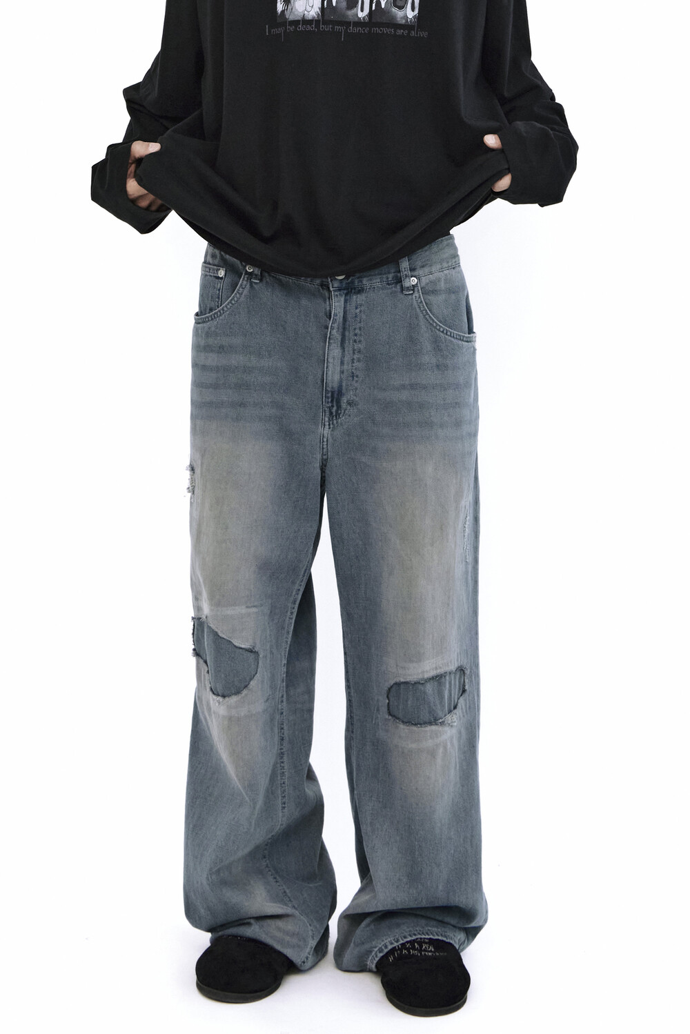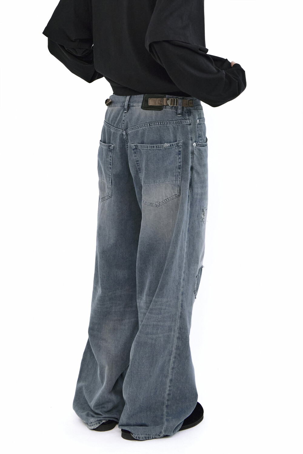 무릎 부분에는 과감한 컷아웃과 패치워크,