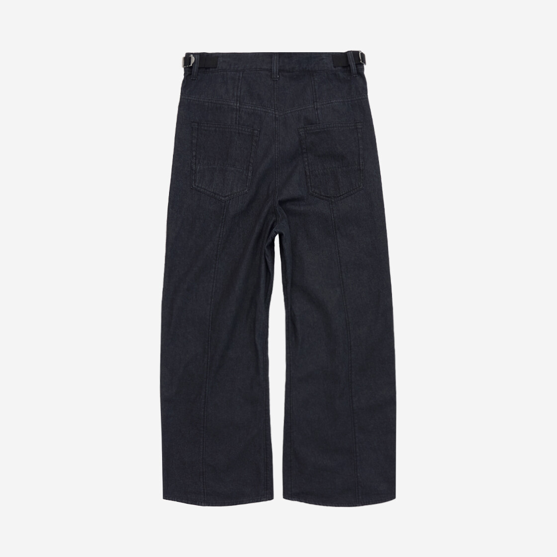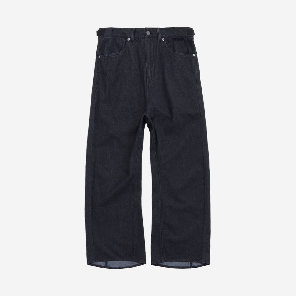 유려한 곡선의 형태로 변주를 준 커브드 데님 팬츠.
