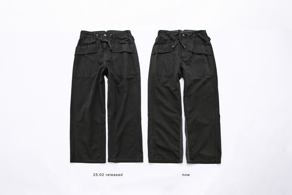 고밀도 조직 특유의 자연스러운 윤이 나는 소재감 위로강한 다잉과 워시 반복 적용,