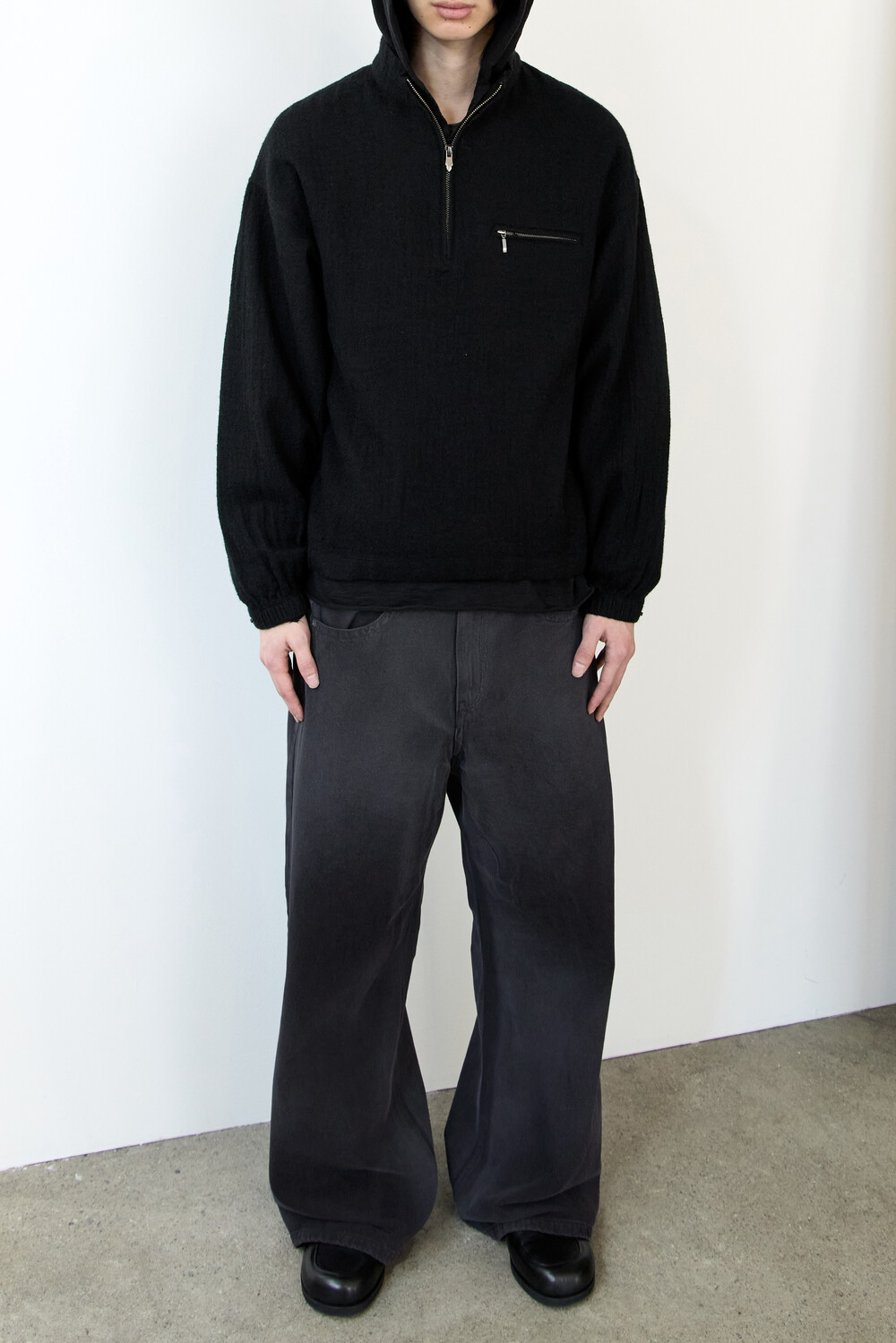*본 제품은 디자인적 의도로 강한 강도의 후가공 및 스톤 워싱을 적용하여, 불규칙한 위치에 워싱 흔적(염료 뭉침, 올 튐 등) 및 미세 데미지, 미세 이염, 잔여 스톤가루가 존재할 수 있습니다.