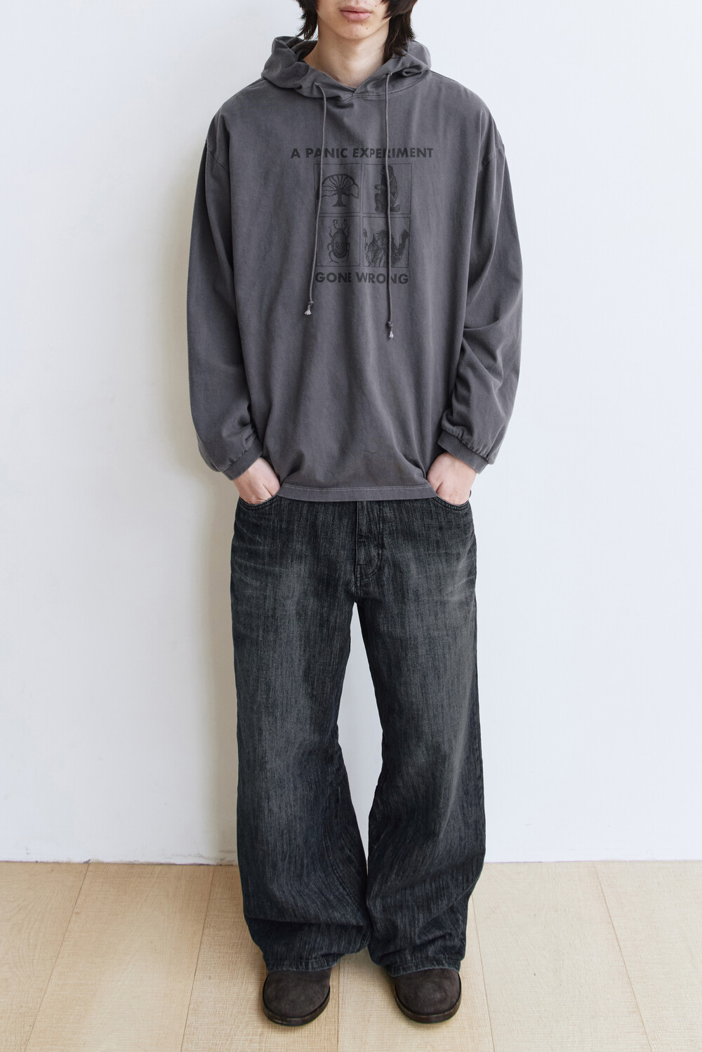 *본 제품은 디자인적 의도로 강한 강도의 후가공을 적용하여, 불규칙한 위치에 워싱 흔적(염료 뭉침, 올 튐 등) 및 미세 데미지, 미세 이염이 존재할 수 있습니다
